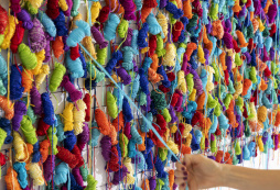 interactive wall installation, hand-made colored yarn balls, nets, nodes